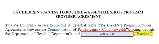 To enroll, providers must complete and sign the highlighted sections in the PA CARES provider agreement and submit it to vaccines@phila.gov with the subject line “PA CARES Enrollment – [Your Site PIN].”