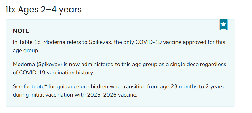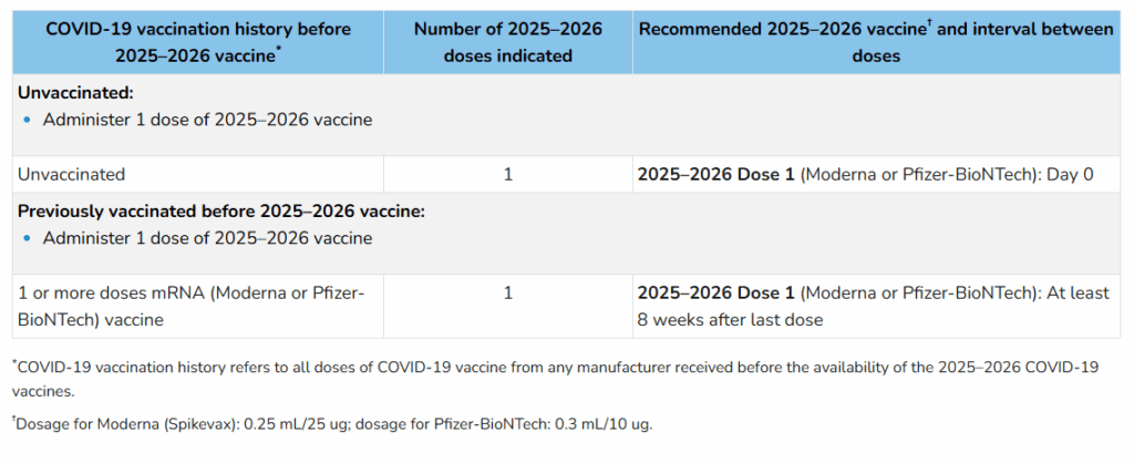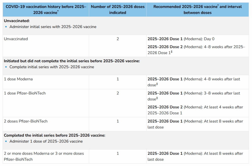 - It is also recommended that children aged 2 years (24 months) and older receive only 1 dose of the 2025-2026 Moderna vaccine, even if previously unvaccinated.