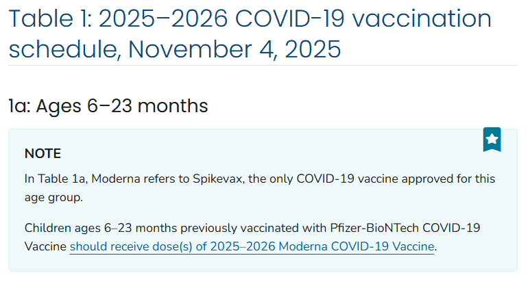 - Now, children aged 6-23 months who are unvaccinated are recommended to receive 2 doses as their primary series. In addition, children aged 6-23 months who previously received 1 dose of Pfizer vaccine should also receive 2 doses of 2025-2026 Moderna vaccine. As a reminder, Pfizer vaccine is no longer available for children aged 6 months-4 years.